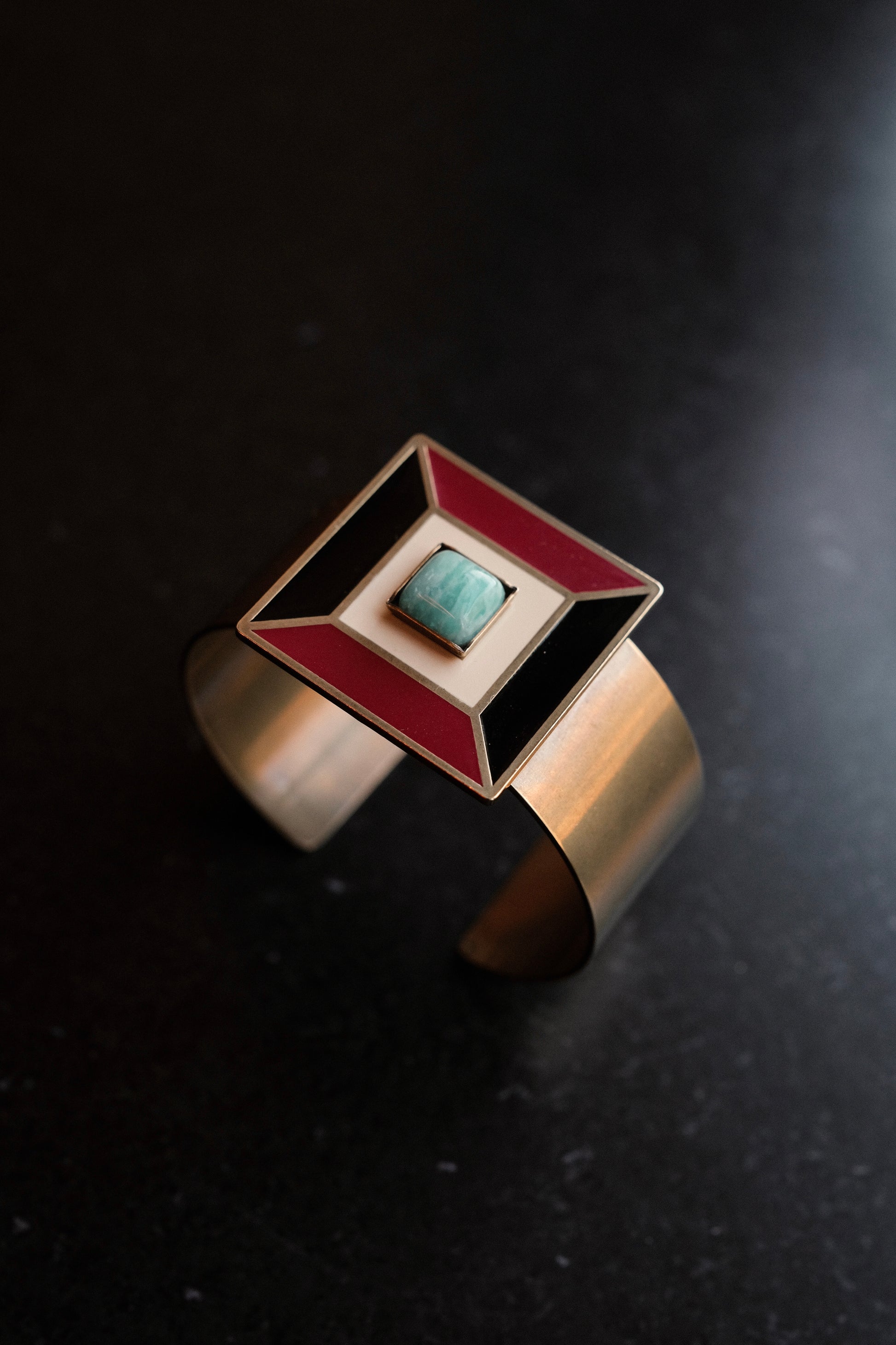 The inaugural piece is an adjustable brass cuff bracelet, adorned with a finely enameled square cradling a natural gemstone at its heart — Peruvian Amazonite cabochon. Its shifting tones of green, white, and turquoise mirror the lush garden glimpsed through the grand dining room window, as though capturing a fragment of landscape in precious form.
